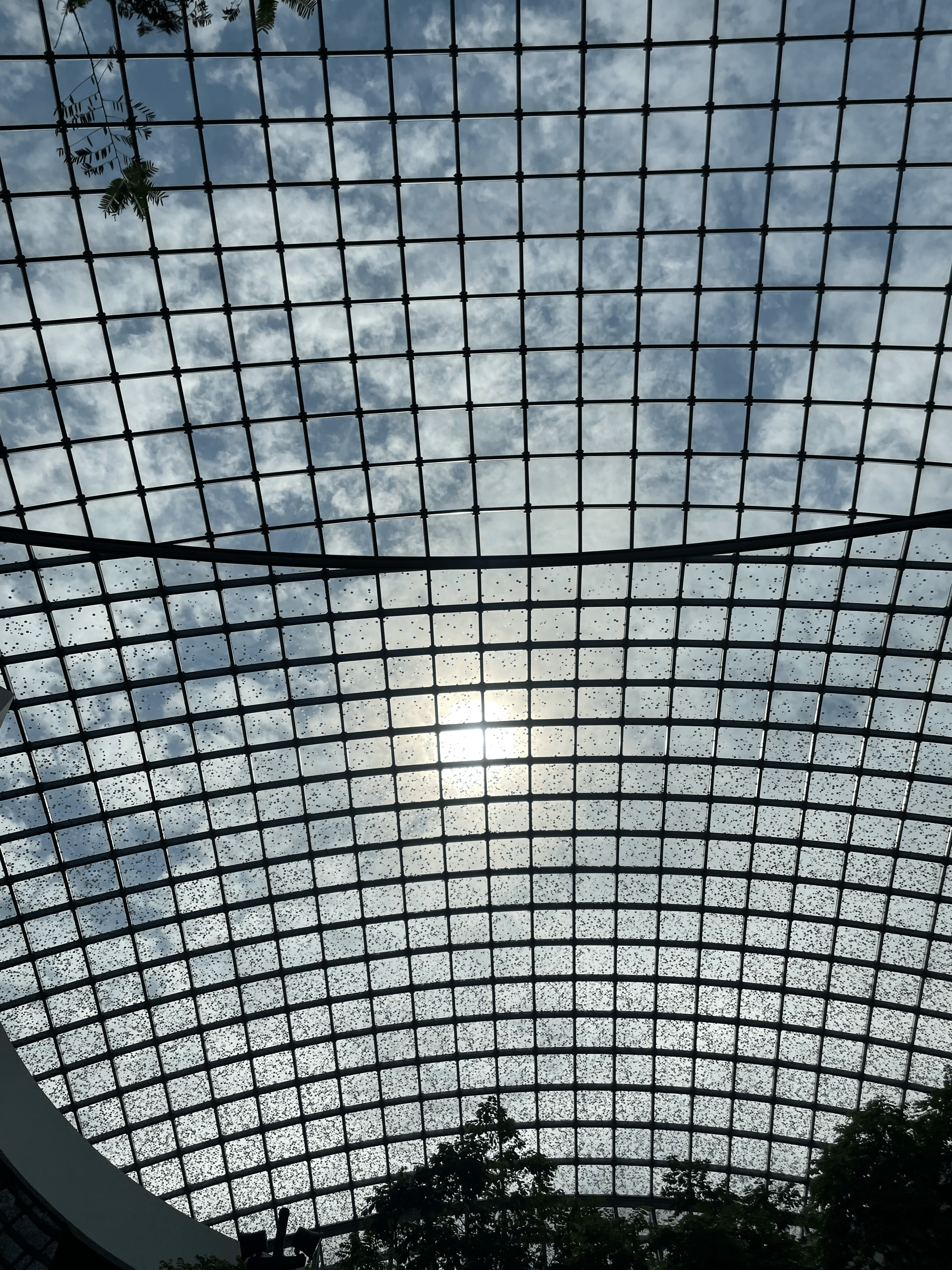 Estes vidros foram confeccionados um a um e na parte de baixo vão perceber umas “manchas” que fazem com que diminua a penetração da luz solar. Foi calculado para maximizar o aproveitamento da luz natural e diminuir consumo de energia para iluminação e ar condicionado